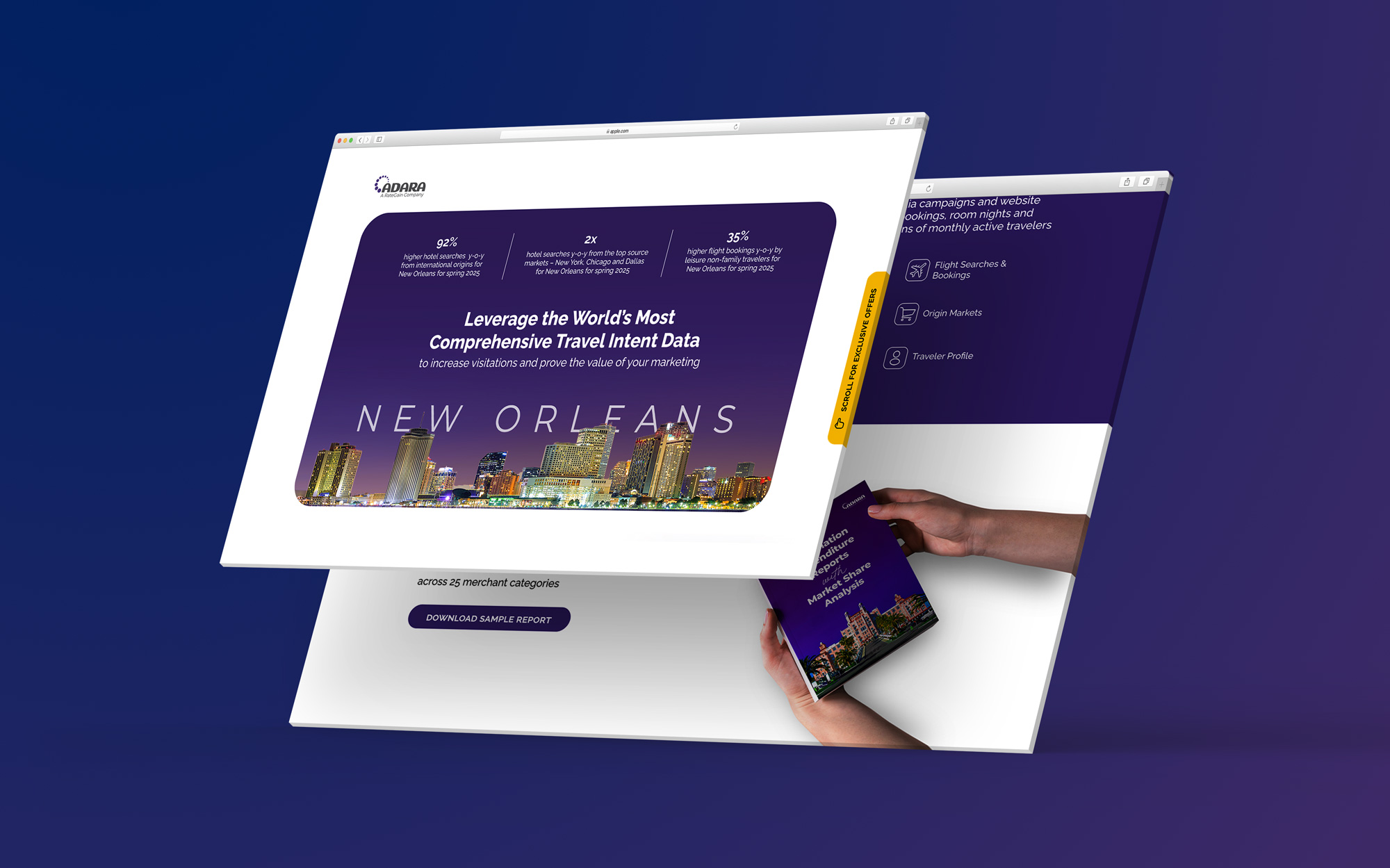 I designed the UI for the ABM – Adara landing page, showcasing insights into New Orleans travelers. The page enables businesses to reach travelers considering competing destinations, targeting them based on their planning stages—searching, planning, and booking. With data-driven targeting, it leverages spending patterns and 30+ intent signals to optimize engagement. The design ensures a seamless user experience, presenting insights clearly while enhancing audience targeting for travel marketers.
