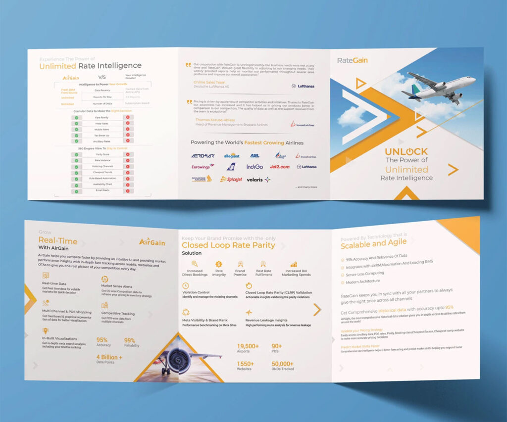This tri-fold AirGain brochure is designed specifically for the travel-tech industry, showcasing RateGain’s powerful airfare intelligence platform in a clean, modern, and data-driven layout. It highlights real-time market insights, competitive pricing analysis, and revenue optimization features to help airlines and travel brands stay ahead in a dynamic, fast-changing market.